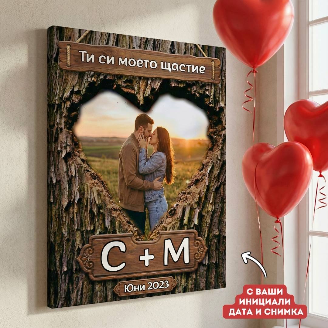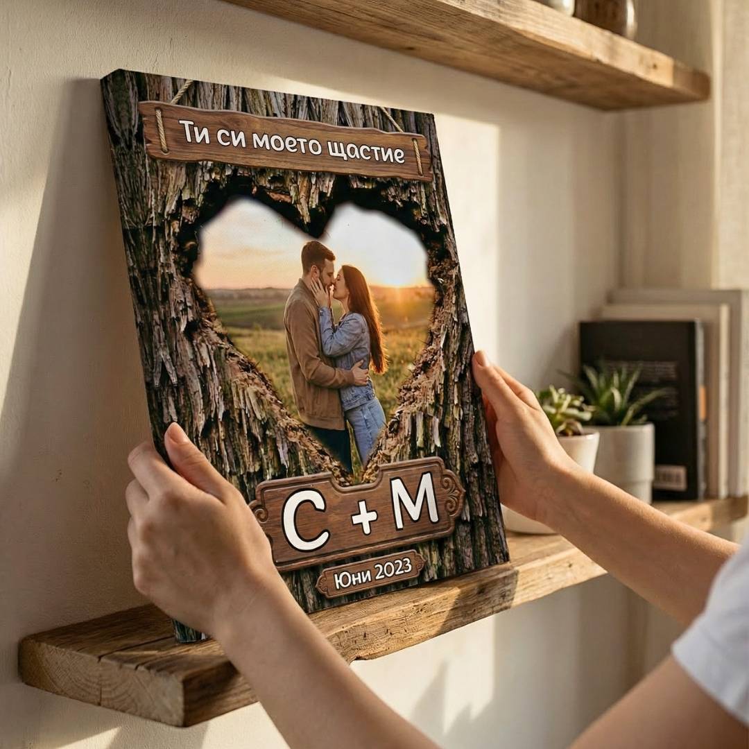 Картина "Картина за Влюбени - Снимка, Инициали и дата в Дърво"