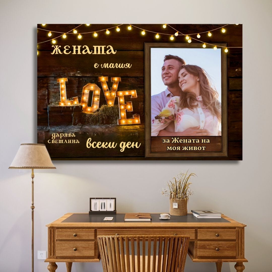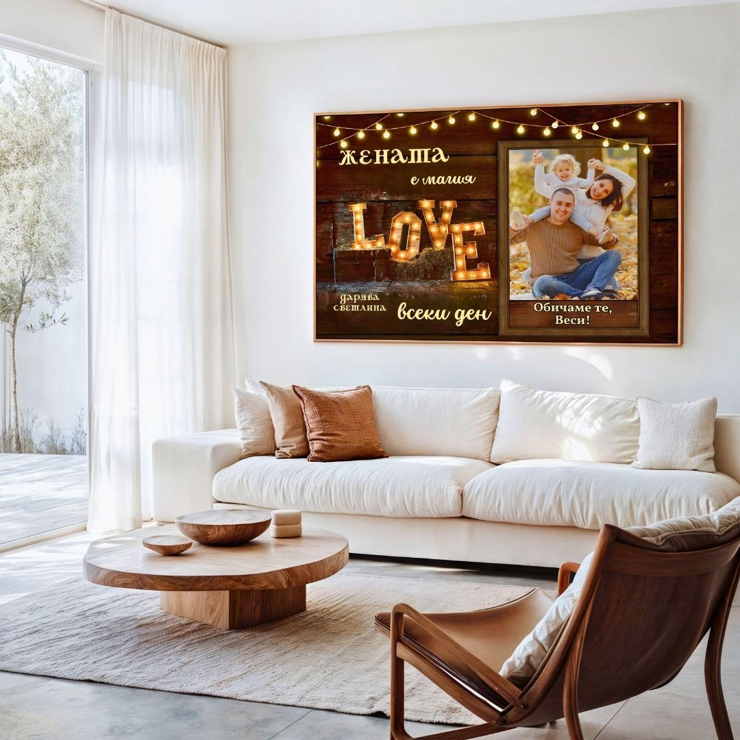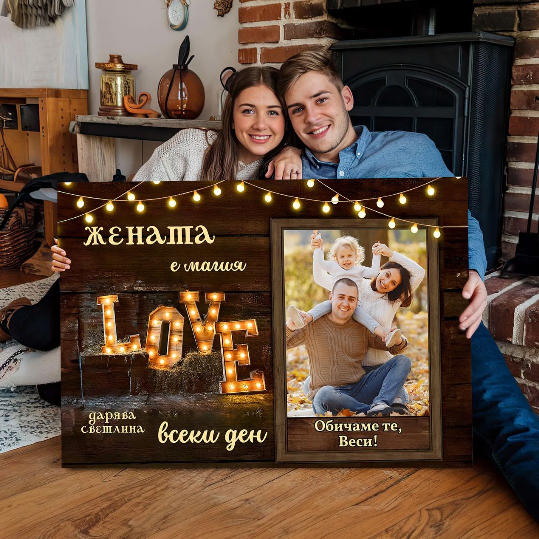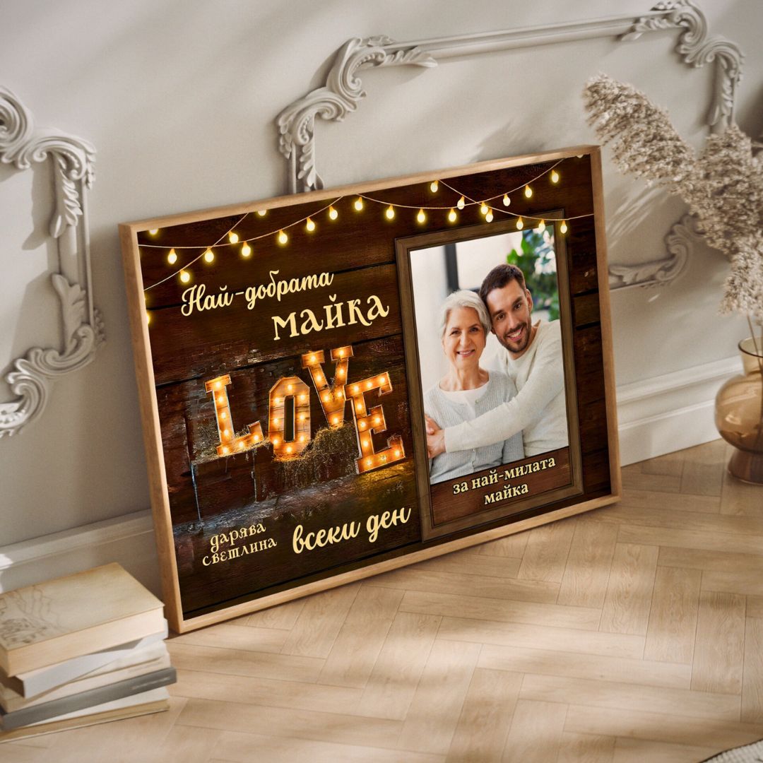 Подарете топлина и светлина с персонализирана картина! Добавете ваша снимка и надпис, за да създадете уникален подарък за най-скъпата жена - майка, съпруга или любима. Идеален избор за 8 март, рожден ден или друг специален повод!